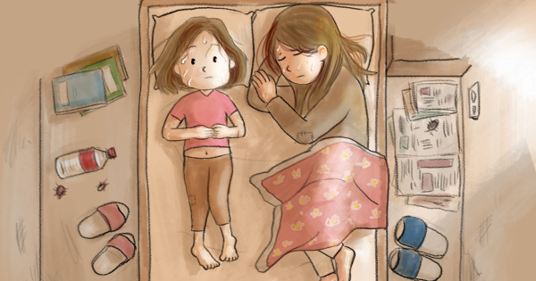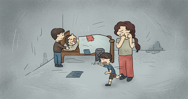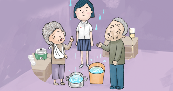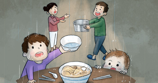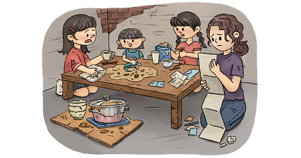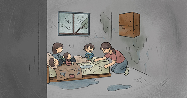 小檸檬一家六口擠在頂樓狹小房間,爸爸用紙板膠帶補天花板,卻擋不住雨水。發霉的牆、泡爛的床墊、裸露的彈簧,甚至劃傷過孩子。生活不只住得不安穩,連吃也常常只有花椰菜和豆腐充飢。