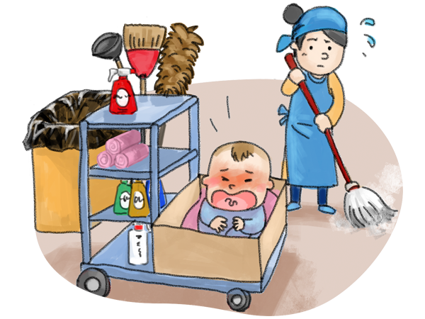 兩歲多的胖古古和媽媽相依為命,住在老舊的平房中,屋外堆滿雜物,廁所是老舊便坑,需要自己提水沖。因為孩子還年幼,又沒人能幫忙照顧,加上經醫師診斷後,發現胖古古的發展較同齡孩子遲緩,需要接受早療,古古媽只好配合孩子做早療的時間,接一些清掃工作。有時,古古媽會帶著古古去工作,她把他放在嬰兒車上,讓他吃零食分散注意力,自己專心工作。胖古古是個乖巧的孩子,平時靜靜地在一旁陪媽媽工作,累了就躺在車裡熟睡,讓古古媽心疼卻也欣慰。
